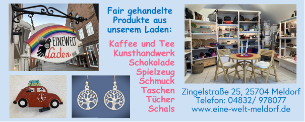 Der Eine Welt Laden handelt nach dem Motto „global denken- lokal handeln“. Durch Einkauf von Produkten aus dem globalen Süden werden die Lebensbedingungen und die sozialen Leistungen unterstützt. Ausschließlich durch den Einsatz der ehrenamtlichen und engagierten Mitarbeiterinnen ist das Ladengeschäft möglich. Kundinnen und Kunden unterstützen dieses durch Ihren Einkauf im Eine Welt Laden Meldorf, den einzigen derzeit in Dithmarschen.